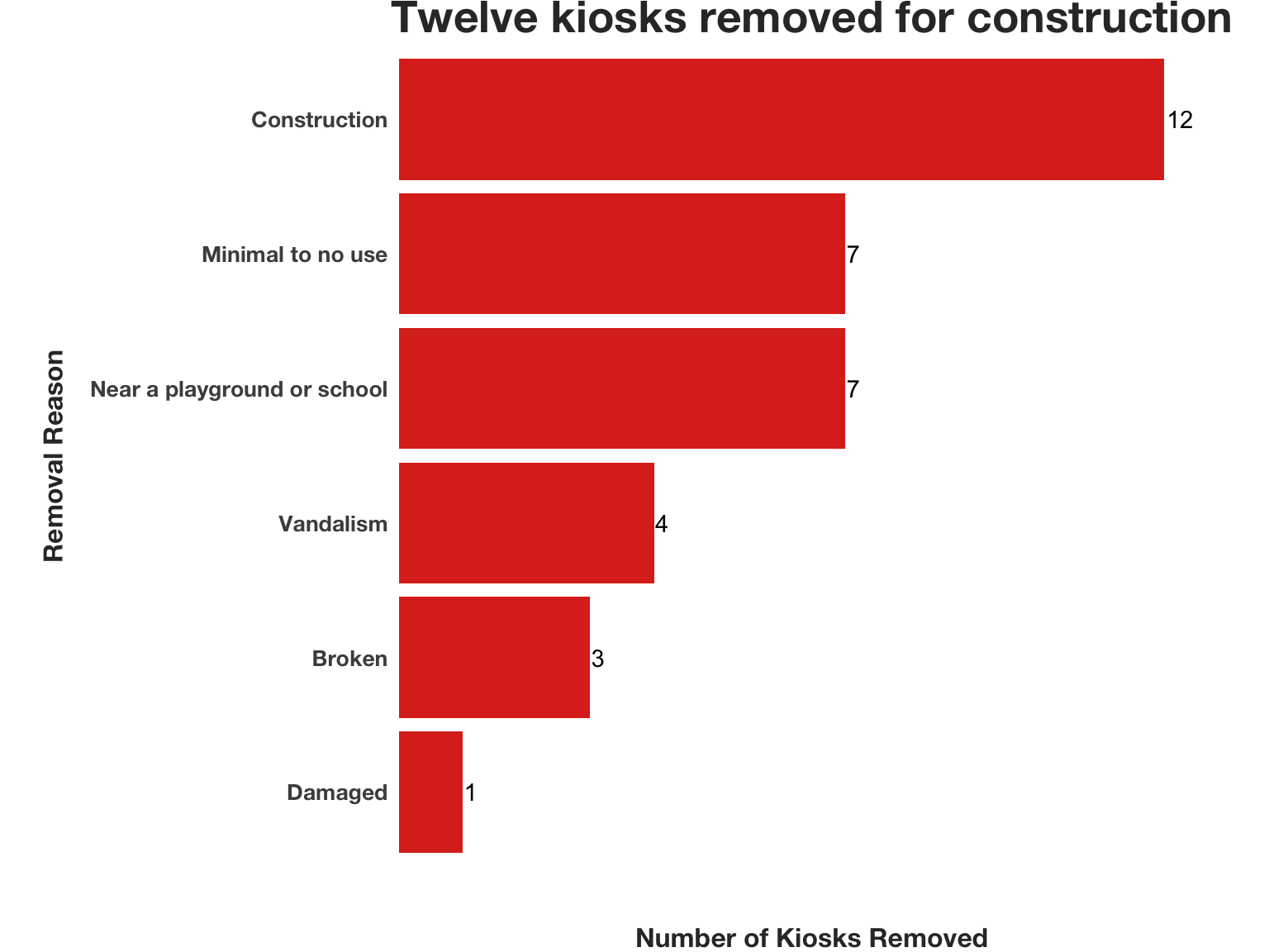 Syringe disposal kiosks have proven to be effective at reducing syringe litter. Further steps towards making a syringe-free city include installing more syringe disposal kiosks in areas with demonstrated risk. Even with their demonstrated success, there are less syringe disposal kiosks now than when the initiative began in 2018. Twelve kiosks were removed due to construction, raising speculation on whether they will be reinstalled. Seven disposal kiosks were removed due to their proximity to a playground or a school, sparking concern whether syringe rates will increase in areas with children at play or if removing the kiosk entirely is the safest option.