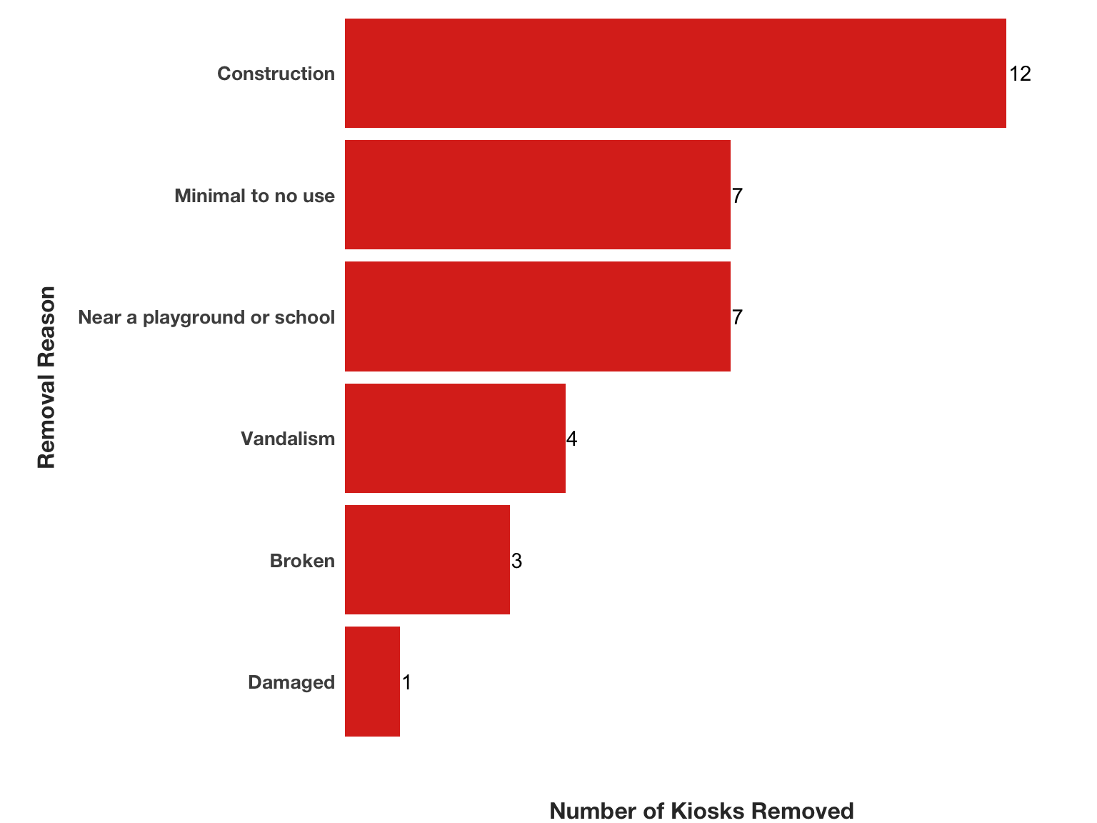 Syringe disposal kiosks have proven to be effective at reducing syringe litter. Further steps towards making a syringe-free city include installing more syringe disposal kiosks in areas with demonstrated risk. Even with their demonstrated success, there are less syringe disposal kiosks now than when the initiative began in 2018. Twelve kiosks were removed due to construction, raising speculation on whether they will be reinstalled. Seven disposal kiosks were removed due to their proximity to a playground or a school, sparking concern whether syringe rates will increase in areas with children at play or if removing the kiosk entirely is the safest option.